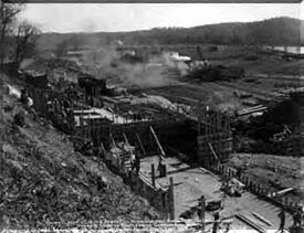 The mammoth project was divided into three major areas of activity. One part was the dam and power house. This also included all of the camps, contructing and maintaining roads, designing and building railways, and erecting a river bridge for rail, car, and wagons. Dozens of permanent and temporary structures were designed and fabricated. Many of the buildings are in use today, a full seventy years later. During low river water levels, wooden piers from the old bridge can still be seen. Steel pilings, girders, and cable are low river water hazards for boats and fishing lines. The dam is of concrete gravity type, 2543 feet long supporting a 20 foot wide roadway and three foot wide sidewalk. The power station is 511 feet long and the flood control spillway section is 520 feet long. The power plant produces 215,000 kilowatts mainly to the eastern part of Missouri and St. Louis.